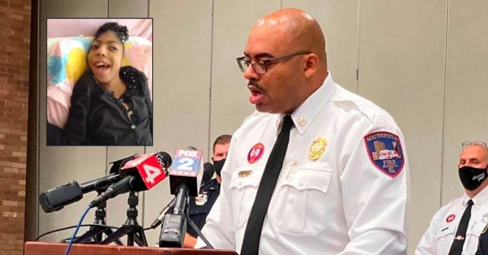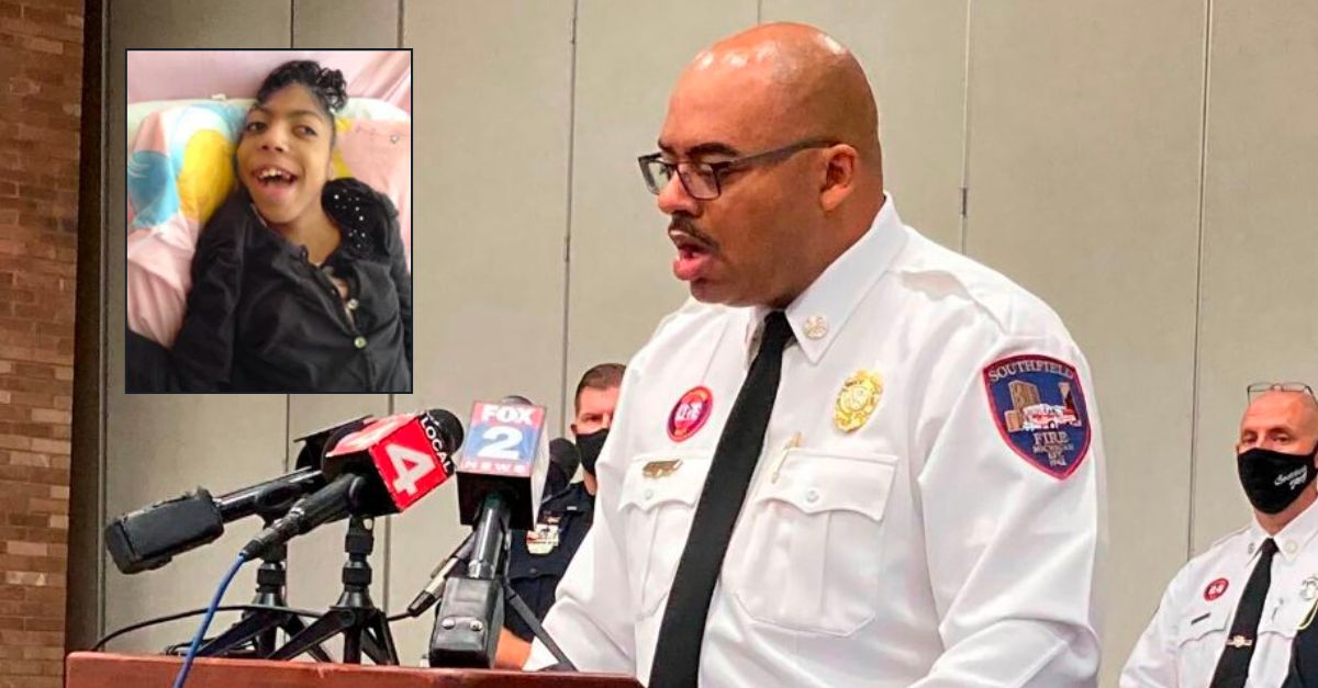 Southfield, Mich., Fire Chief Johnny Menifee holds a news conference on Wednesday, Aug. 26, 2020, in Southfield, Mich., in response to questions about a woman, Timesha Beauchamp, who was found alive at a funeral home. A Southfield emergency medical crew said there were no signs of life when they were called to Beauchamp”s home on Aug. 23, 2020. (AP Photo/Ed White). Inset: Timesha Leshay Beauchamp (via O.H. Pye, III Funeral Home).