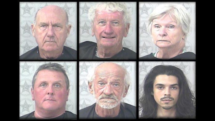 In a statement, the St. Lucie County Sheriff’s Office said numerous people complained about the alleged perpetrators’ nudity. Daniel Harrisson, 77, Donald L. Knapp, 74, Gaetane Lambert, 73, Steven Marhenke, 60, Elmer Quandt, 77, and Nickolas Ramos, 27, were arrested Oct. 25.