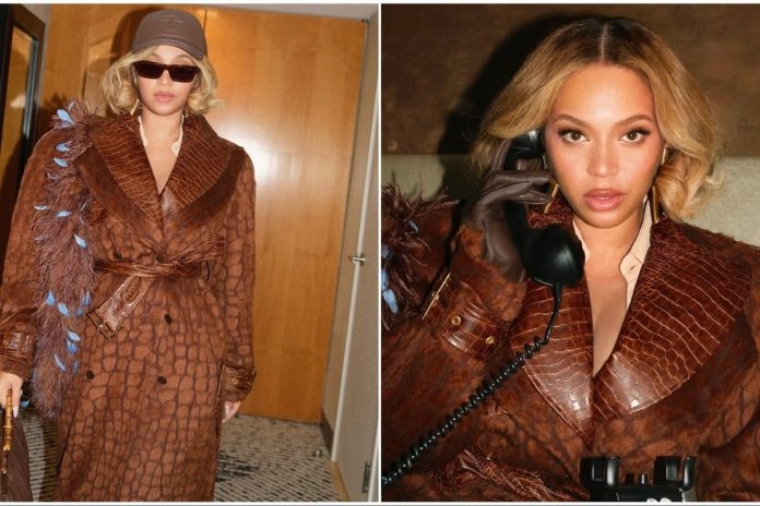 Bey’s dump featured her in an all-brown, suede trench coat and blue jeans, plus a feathery scarf and a matching hat on top of her bold bob.