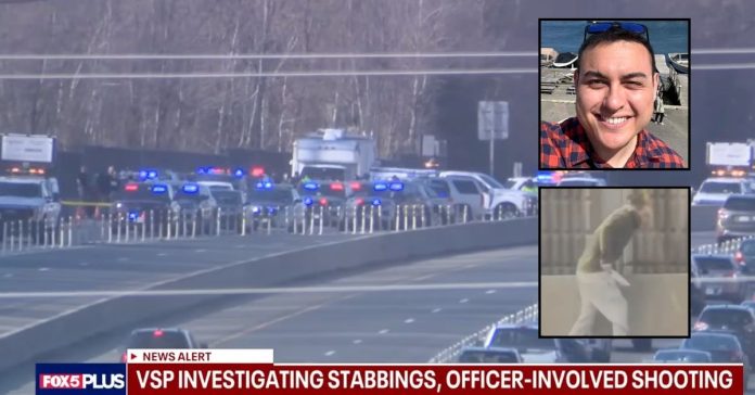 A Virginia State Police trooper was called to the scene at about 1:17 p.m. “for a reported road rage incident,” the law enforcement agency said. The trooper arrived and was “confronted” by Llamado, who reportedly still held a knife. The trooper shot the suspect “in self-defense.”