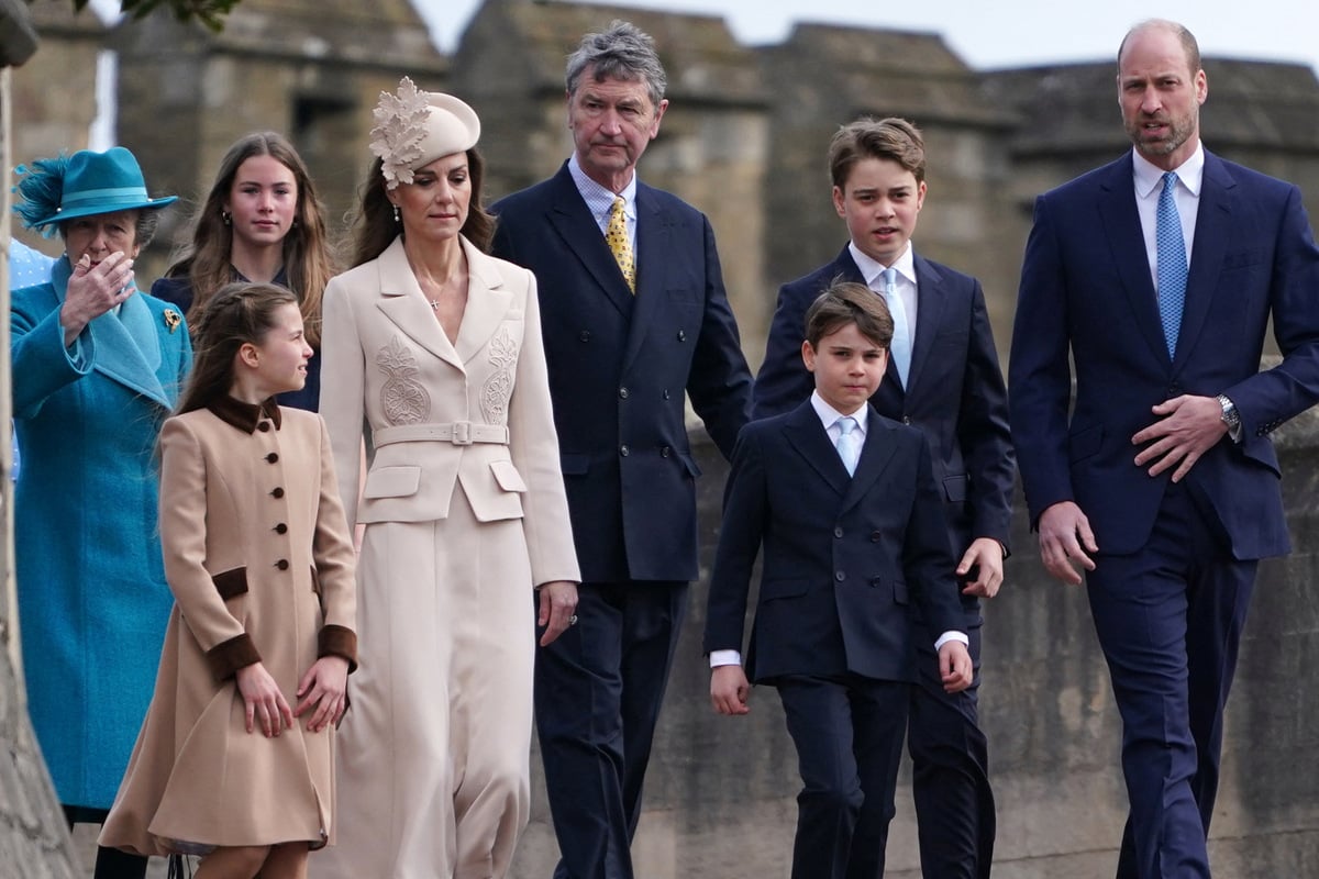 Prince William and his wife Catherine, the Princess of Wales, wearing a beige suit and hat, attended the service with their three children. The family smiled and waved at wellwishers as they entered the chapel.