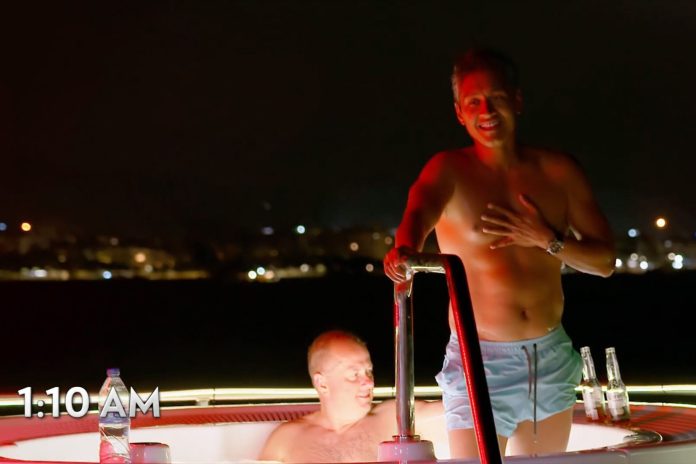 Unfortunately for Cathy, the night was far from over. Not long after Imrul and Mike drunkenly left the jacuzzi around 2:45 a.m., producers captured the guests stumbling around the yacht, knocking on other guests’ doors, and causing a new mess when Mike walked into a wall and dropped his drink, shattering glass in the hallway. Cathy quickly stepped in.