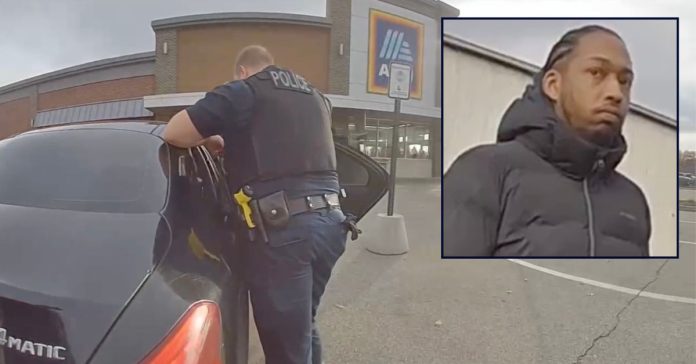 Inset: Dazhawn Richardson speaking to police after allegedly leaving his 1-year-old in the car to go shopping (Solon Police Dept.). Background: Officers retrieving Richardson’s child from the car (Solon PD).