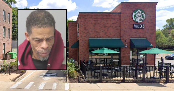 Inset: Keith Brown (St. Louis Metropolitan Police Department). Background: The Starbucks and its drive-thru on 2350 South Grand Blvd. in St. Louis, Missouri (Google Maps).