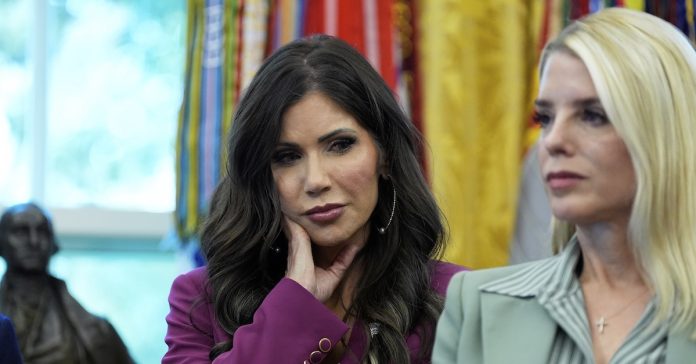 Homeland Security Secretary Kristi Noem, left, and Attorney General Pam Bondi listen as President Donald Trump speaks in the Oval Office of the White House, Monday, Sept. 15, 2025, in Washington (AP Photo/Alex Brandon).