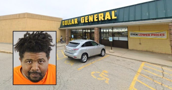 Inset: Lenard Hale (Waukesha County Sheriff’s Office). Background: The Dollar General in Wisconsin where Lenard Hale allegedly mowed down a former co-worker after being fired (Google Maps).