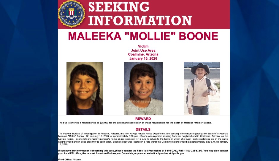 Anyone with information about Mollie’s case should contact the FBI at 1-800-CALL-FBI (1-800-225-5324) or online at tips.fbi.gov. Tispters can also contact the Navajo Police Department, Tuba City District, at 928-283-3111 or 928-283-3112.