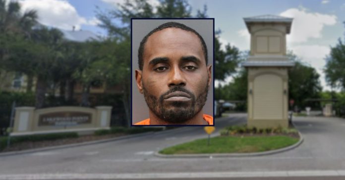 Eric Patterson appears in a booking photo inset against an image of an apartment complex in Florida.