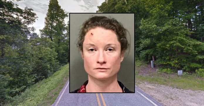 Inset: Megan Thomas (Wilkes County Sheriff’s Office). Background: The area in North Carolina where Megan Thomas lives in Moravian Falls, where she allegedly shot and killed her boyfriend (Google Maps).