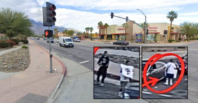 Insets: A group in Palm Springs, Calif., are seen asking motorists for donations to help with funeral expenses for a “deceased” child who is still alive, according to cops (Palm Springs Police Department). Background: The intersection at Ramon Road and San Luis Rey Drive in Palm Springs where police say “scammers” were taking advantage of “good-hearted” drivers with a dead child scheme (Google Maps).