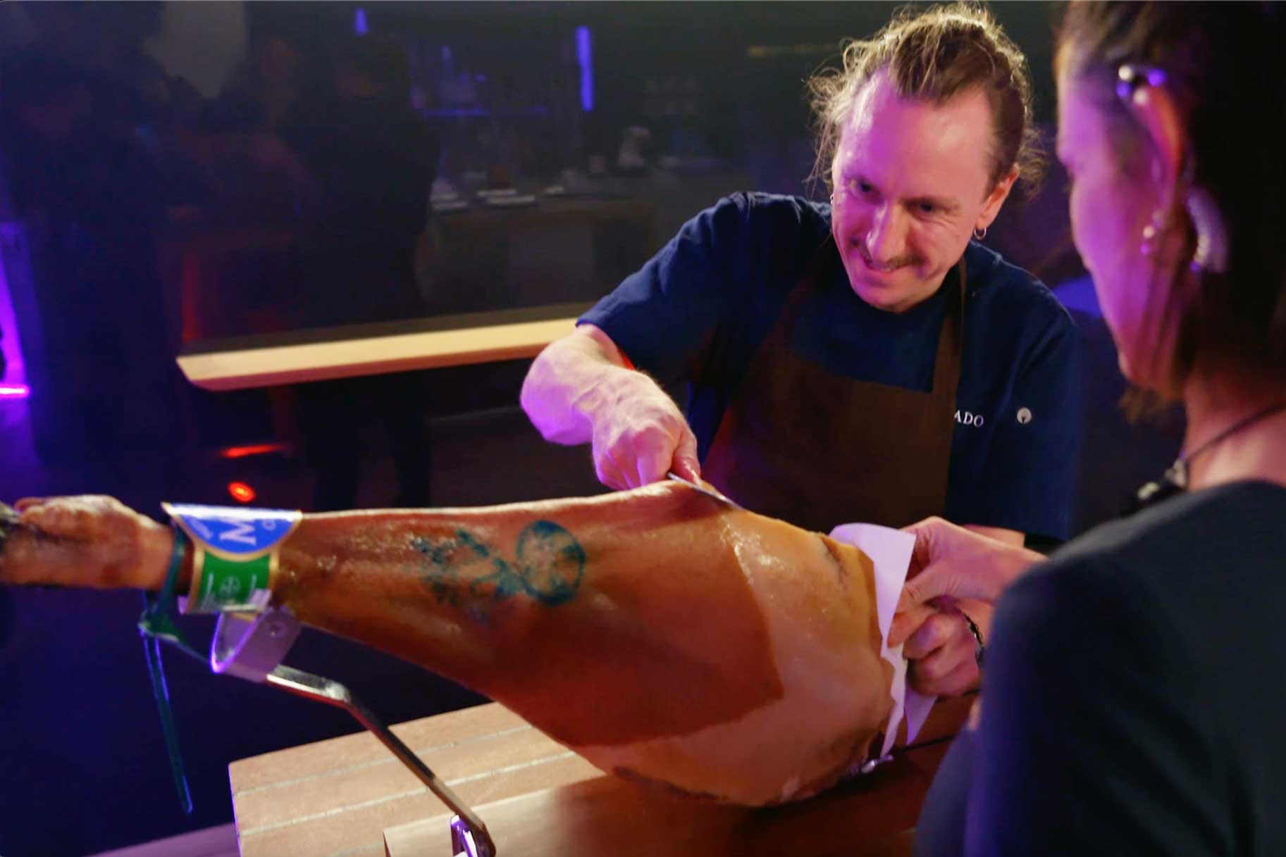 The guests are thrilled as he carries the jambon on deck in the preview, with one saying, “Yes! Get in my belly!” The dish is dramatically displayed with the meat suspended in the air. Josh jokes, “I need to be taller for this,” as he starts carving the dish. All of a sudden, a guest critiques his carving style. “I just know that it’s usually from the side—like carve it from the side,” she tells him.