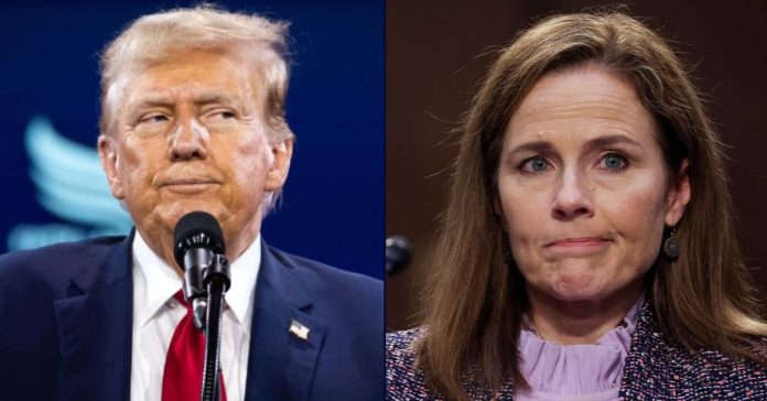 Left: Donald Trump speaks at the annual Road to Majority conference in Washington, DC, in June 2024 (Allison Bailey/NurPhoto via AP). Right: Justice Amy Coney Barrett testifies before the Senate Judiciary Committee on the third day of her confirmation hearings on Capitol Hill on October 14, 2020 in Washington, D.C., (Jonathan Ernst-Pool/Getty Images).