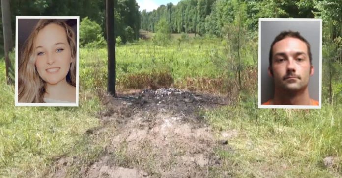 Inset left: Megan Bodiford (GoFundMe). Inset right: Jarrett Davis (Bamberg County Sheriff”s Office). Background: The location where the burned car containing Bodiford’s remains was found (WIS/YouTube).