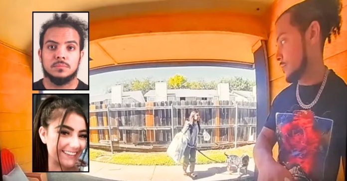 Inset top: Kaleb Mickens (Tarrant County Sheriff”s Office). Inset bottom: Sheila Cuevas (GoFundMe). Background: A photo appears to show Mickens, Cuevas, and his dog outside of a building (KDFW/YouTube).
