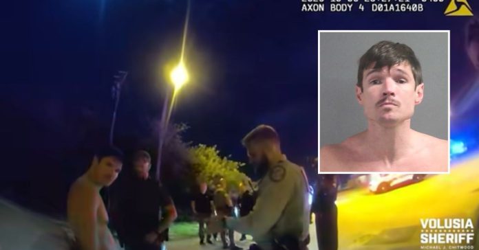 Inset: Grant Hagood-James. Background: Hagood-James after he was arrested for allegedly carjacking a man in Dayton Beach Shores, Florida (Volusia County Sheriff”s Office).