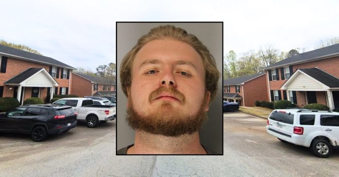 Inset: Hunter Mathis (Hall County Sheriff’s Office). Background: The Georgia apartment complex where Hunter Mathis allegedly threatened to “crush” a woman’s skull on the pavement and “cut her heart out” (Google Maps).