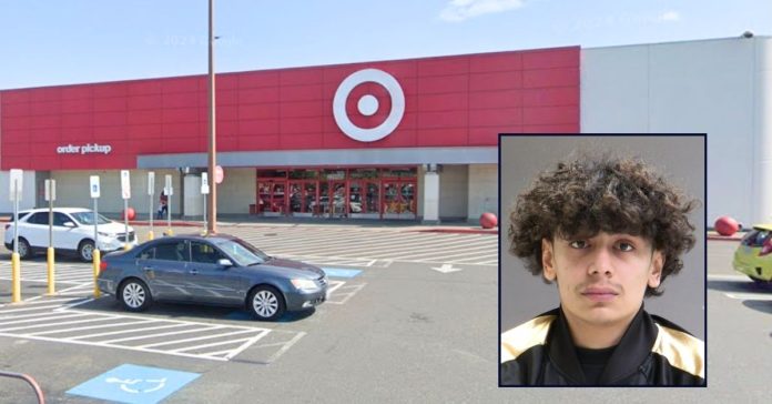 Inset: Cedric Valdez (Hillsboro Police Department). Background: The Target in Hillsboro, Ore., where cops say Cedric Valdez was caught and arrested for his “school project” scheme (Google Maps).