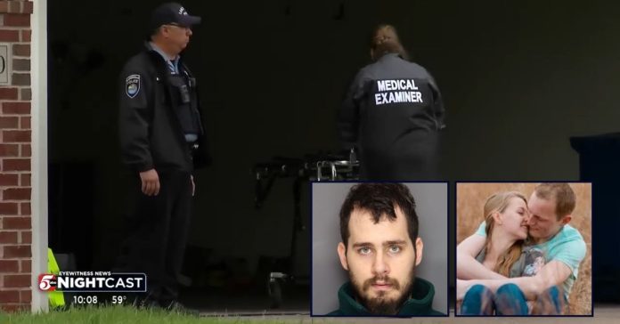 Left inset: Jack Ball (Dakota County Sheriff’s Office). Right inset: Bethany Ann Israel and her husband Josh Israel (GoFundMe). Background: Authorities at the Minnesota home where Bethany Israel’s brother, Jack Ball, killed and dismembered her (KSTP/YouTube).