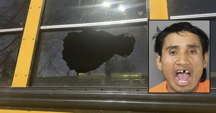 Background: A photo of the school bus that was hit by a rock on Jan. 7 (New Jersey State Police). Inset: Hernando Garciamorales (Bergen County Sheriff”s Office).