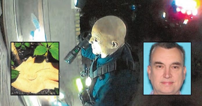 Background: Security footage allegedly shows Vance Boelter in a latex rubber mask outside the home of Sen. John Hoffman, prosecutors say (DOJ). Left inset: The mask that Vance Boelter allegedly wore during his coordinated shooting attacks (DOJ). Right inset: Vance Boelter (Minnesota Department of Public Safety).