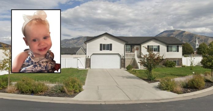 Background: The home where Carrie Murray and Mitchell Murray allegedly killed their daughter, Ruby Marie Murray, in Nibley, Utah (Google Maps). Inset: Ruby Marie Murray (Gillies Mortuary).