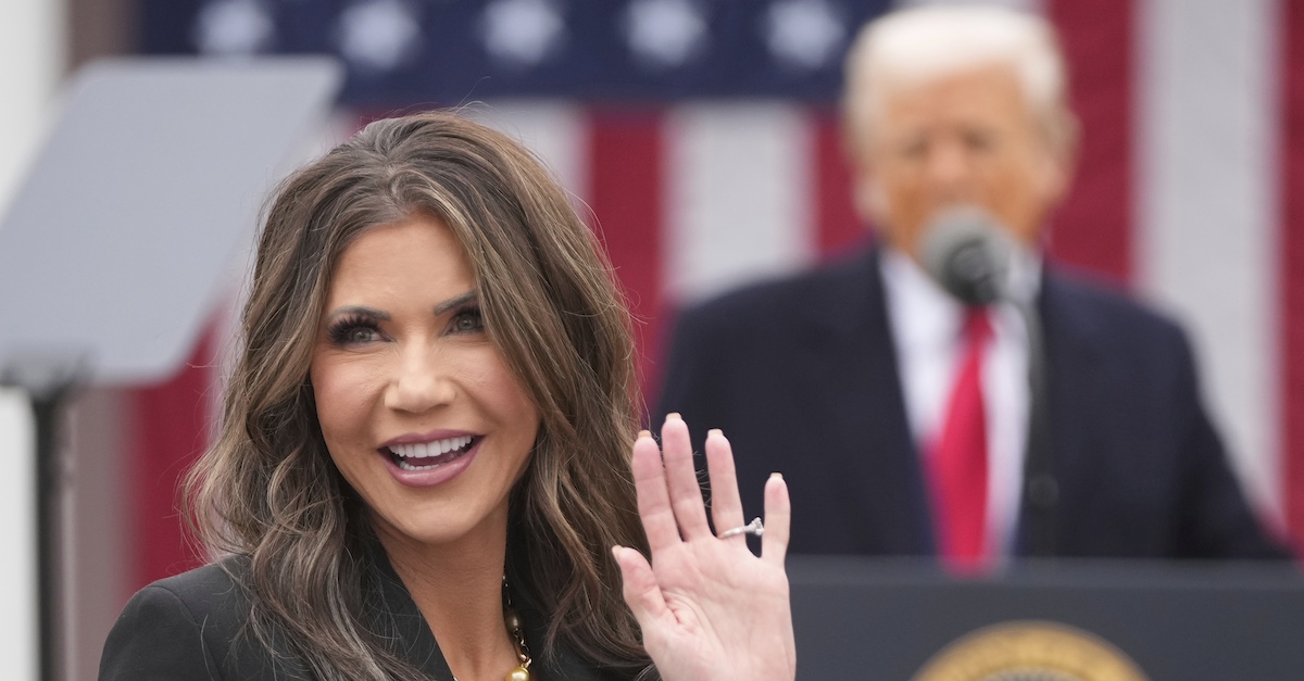 FILE – Homeland Security Secretary Kristi Noem is recognized as President Donald Trump speaks during an event to announce new tariffs in the Rose Garden at the White House, April 2, 2025, in Washington (AP Photo/Mark Schiefelbein, File).