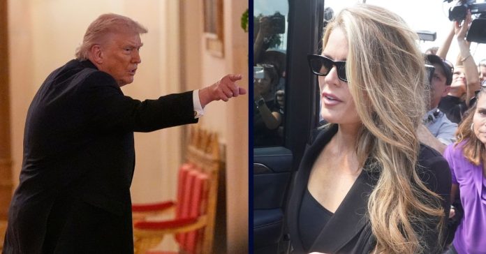Left: President Donald Trump waves in the Cross Hall after at an event to honor the 2025 Major League Soccer champions Inter Miami CF in the East Room of the White House, Thursday, March 5, 2026, in Washington (AP Photo/Alex Brandon). Right: Attorney Lindsey Halligan leaves the Paul G. Rogers Federal Building and U.S. Courthouse in West Palm Beach, Fla., Thursday, Sept. 1, 2022 (AP Photo/Wilfredo Lee).