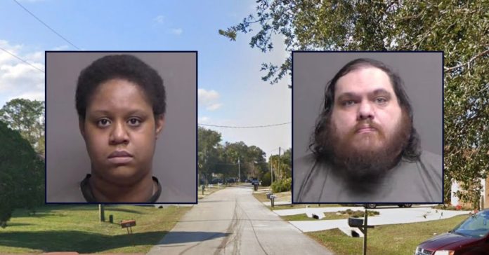 Inset, left to right: Tashaye Brown and Nikolas Cummings (Flagler County Sheriff’s Office). Background: The area in Florida where the couple lived (Google Maps).
