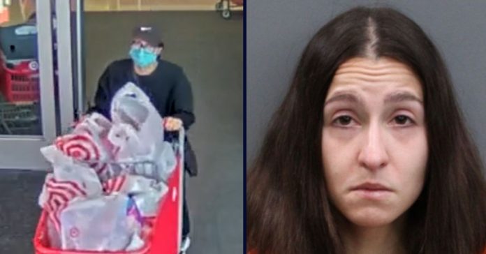 Left: Bailey Slater walks out of a Target near Tampa, Florida, after she allegedly stole a hospital patient”s credit card (Hillsborough County Sheriff’s Office). Right: Slater’s mug shot (Hillsborough County Sheriff’s Office).