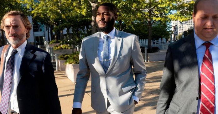 St. Louis Sheriff Alfred Montgomery, center, leaves the Thomas F. Eagleton U.S. Courthouse with his attorneys Bill Margulis, left, and Justin Gelfand, right, in St. Louis on Thursday, Oct. 9, 2025 (Laurie Skrivan/St. Louis Post-Dispatch via AP).