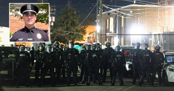 Background: Riot police stand in formation during a protest outside of the Broadview Immigration and Customs Enforcement processing and detention facility in Broadview, Illinois on November 15, 2025 (Photo by Bryan Dozier/NurPhoto via AP). Inset: Officer Radule Bojovic (Hanover Park Police Department).