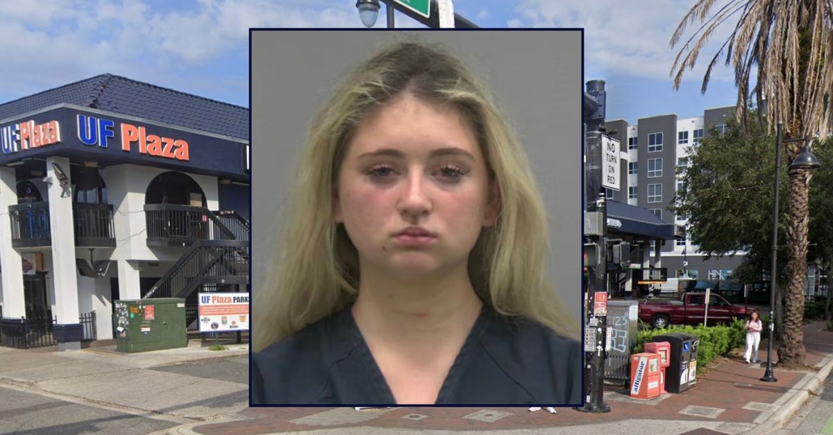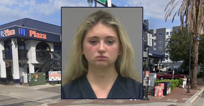 Inset: Sierra H. Lindberg (Alachua County Sheriff”s Office). Background: UF Plaza in Gainesville, where the alleged attack took place (Google Maps).