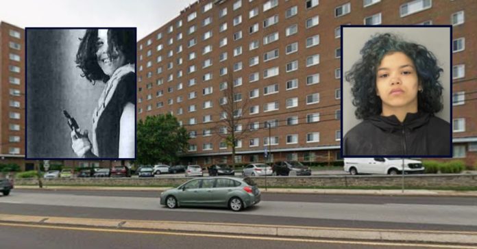 Insets, left: Precious Hamilton allegedly holds a firearm. Right: Hamilton”s mug shot (Montgomery County District Attorney). Background: The apartment in Abington Township, Pennsylvania, where Hamilton accidentally shot her ex-boyfriend, cops say (Google Maps).