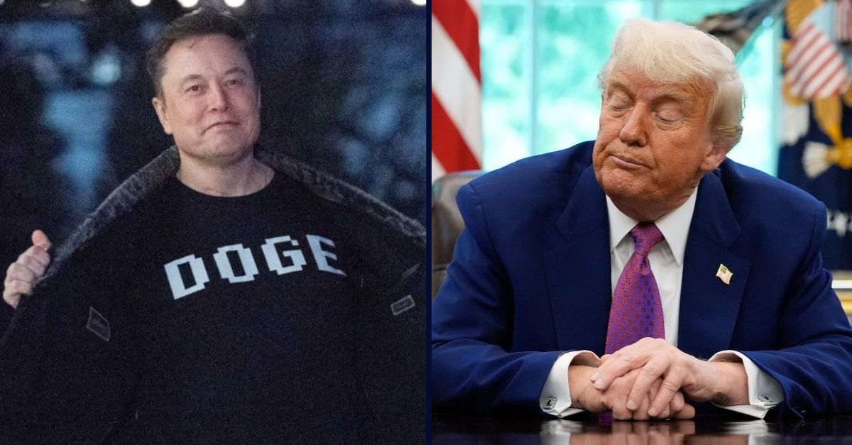 Left: Elon Musk flashes his T-shirt that reads “DOGE” to the media as he walks on South Lawn of the White House, in Washington, Sunday, March 9, 2025 (AP Photo/Jose Luis Magana). Right: President Donald Trump pauses as he speaks in the Oval Office of the White House, Tuesday, May 20, 2025, in Washington (AP Photo/Alex Brandon).