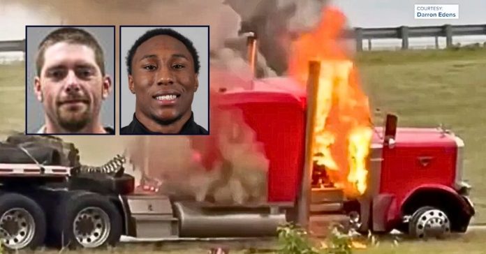 Investigators say McAdams went on to cause several more crashes before “he could no longer operate the vehicle and came to a controlled stop.” Cellphone footage reportedly shows his red Peterbilt engulfed in flames afterward.
