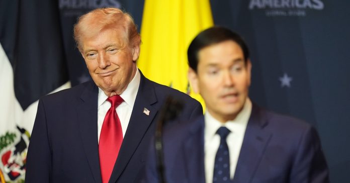 President Donald Trump listens while Secretary of State Marco Rubio speaks at the Shield of the Americas Summit, Saturday, March 7, 2026, at Trump National Doral Miami in Doral, Fla. (AP Photo/Rebecca Blackwell).