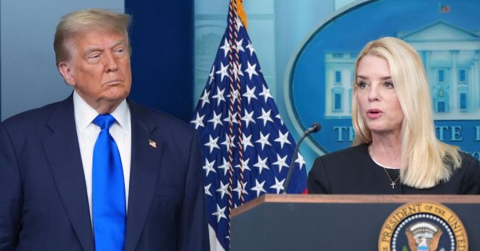 FILE – Attorney General Pam Bondi speaks to reporters as President Donald Trump listens, June 27, 2025, in the briefing room of the White House in Washington (AP Photo/Jacquelyn Martin, File).