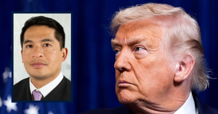 President Donald Trump attends a joint news conference with Ukraine”s President Volodymyr Zelenskyy following a meeting at Trump’s Mar-a-Lago club, Sunday, Dec. 28, 2025, in Palm Beach, Fla. (AP Photo/Alex Brandon). Inset: U.S. Circuit Judge Patrick Bumatay (9th U.S. Circuit Court of Appeals).
