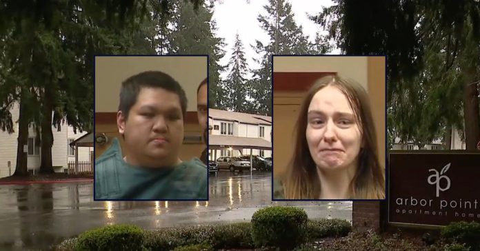 Inset, left to right: Mark Anthony Labaco Clamor and Alyssa Jade Vanderbeck in court on March 12 (KOMO). The apartment complex where the couple lived with their newborn son (KOMO).