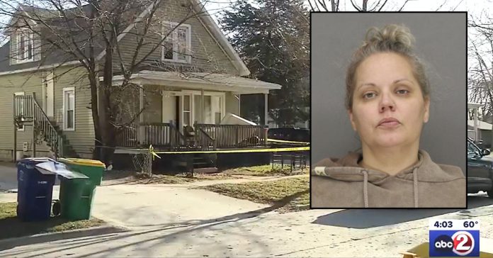 Background: News footage of the home in Green Bay, Wis., where Tonia Piontek allegedly stabbed her fiance on April 13, 2025 (WBAY). Inset: Tonia Piontek (Brown County Sheriff”s Office).