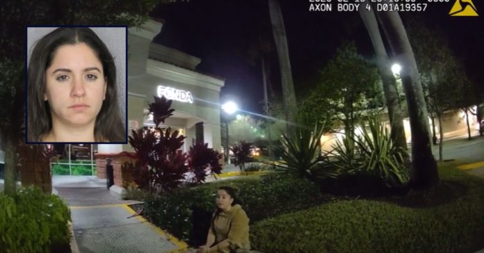 Inset: Emily Sabogal (Miami-Dade Corrections). Background: Body camera video of Sabogal”s arrest after she allegedly left her children alone in an Uber for two hours (Sunrise police via WPLG).